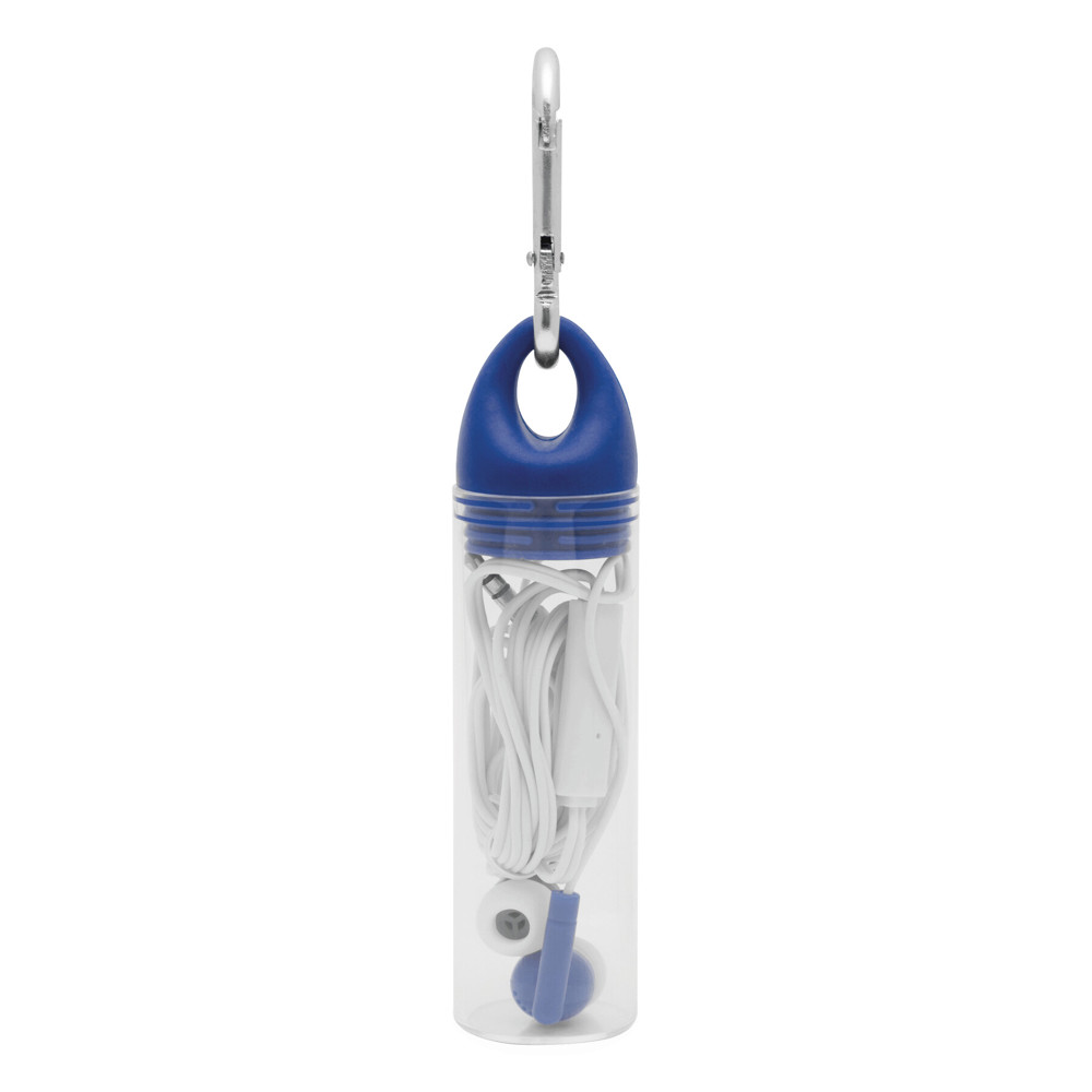 Oortelefoontjes LISTEN & TALK: incl. geintegreerde microfoon en knop voor telefoonopname, 3,5mm plug, kabellengte ca. 120 cm, in kunststof box met gekleurde dop en aluminium karabijnhaak.