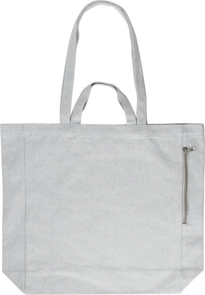 Polyester boodschappentas en gerecycled katoen (350 g/m²) met korte en lange hengsels. Zakje met rits aan de zijkant.