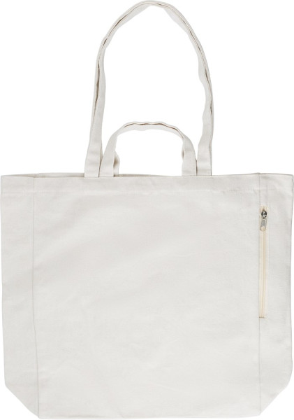 Polyester boodschappentas en gerecycled katoen (350 g/m²) met korte en lange hengsels. Zakje met rits aan de zijkant.