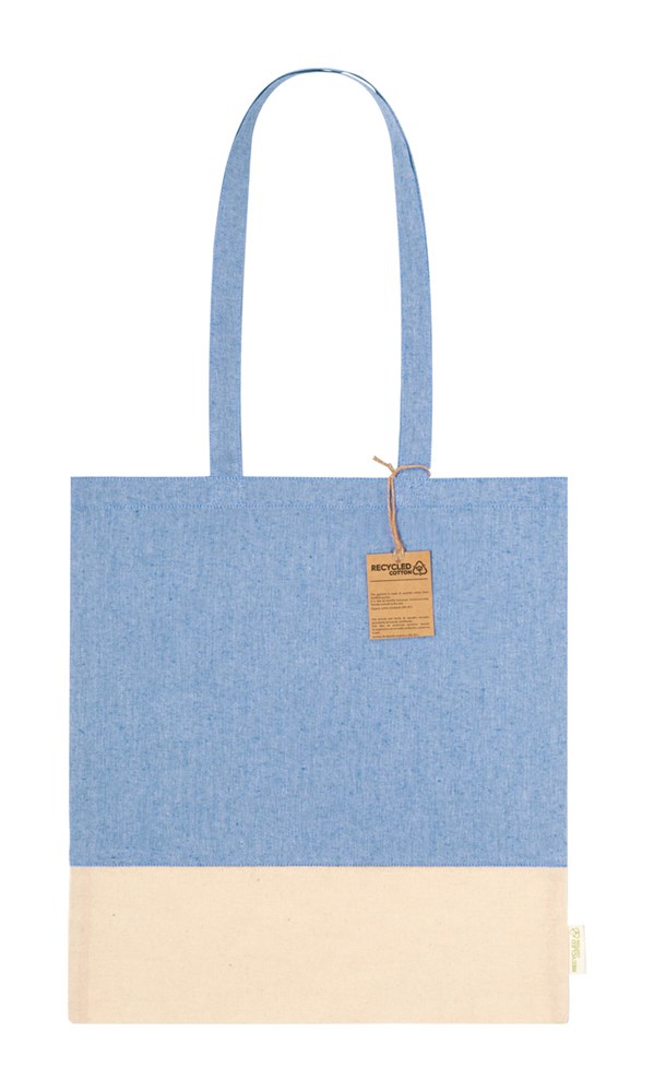 Tweekleurige boodschappentas van gerecycled katoen met lange hengsels en opvallend label van gerecycled katoen. 100% gerecycled katoen, 120 g/m².