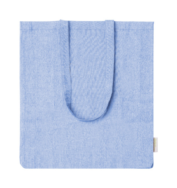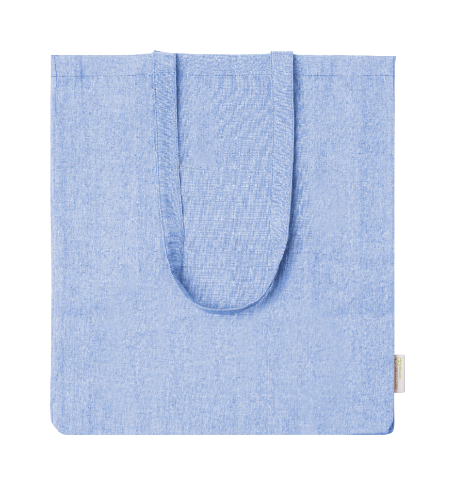 Boodschappentas van gerecycled katoen met kruisje, lange hengsels en opvallend label van gerecycled katoen. 100% gerecycled katoen, 140 g/m².