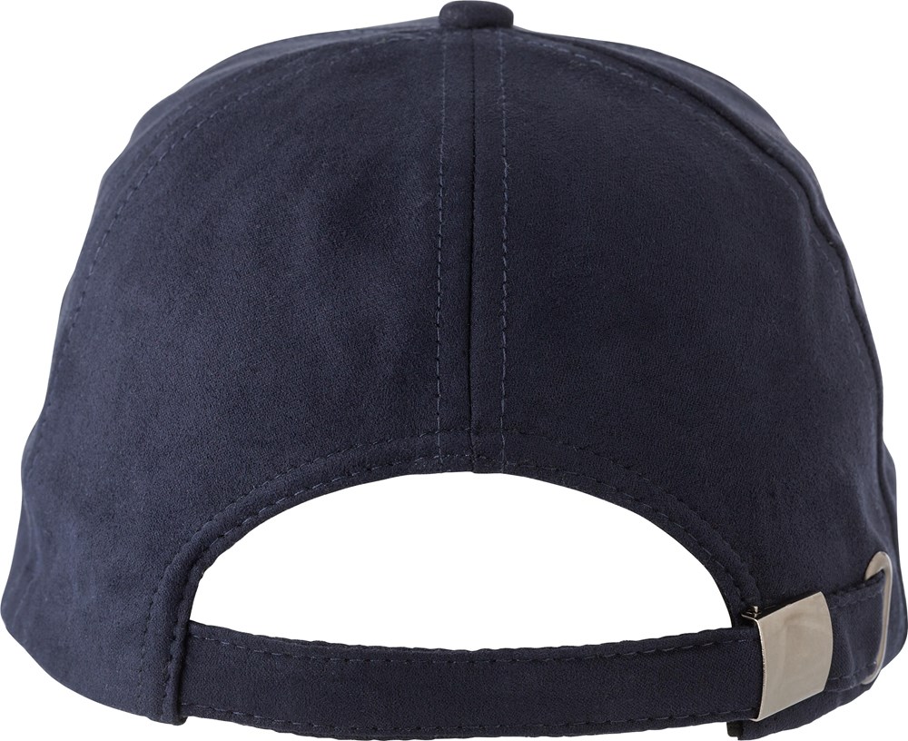 Suède pet met zes panelen en een metalen gespsluiting aan de achterkant. Gaatjes aan de voorkant van het paneel voor.