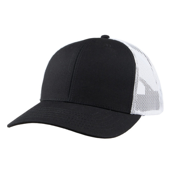 6 panel mid visor trucker cap met frontvoering. American profile. Kunststof druksluiting. Uitgevoerd in katoen en mesh