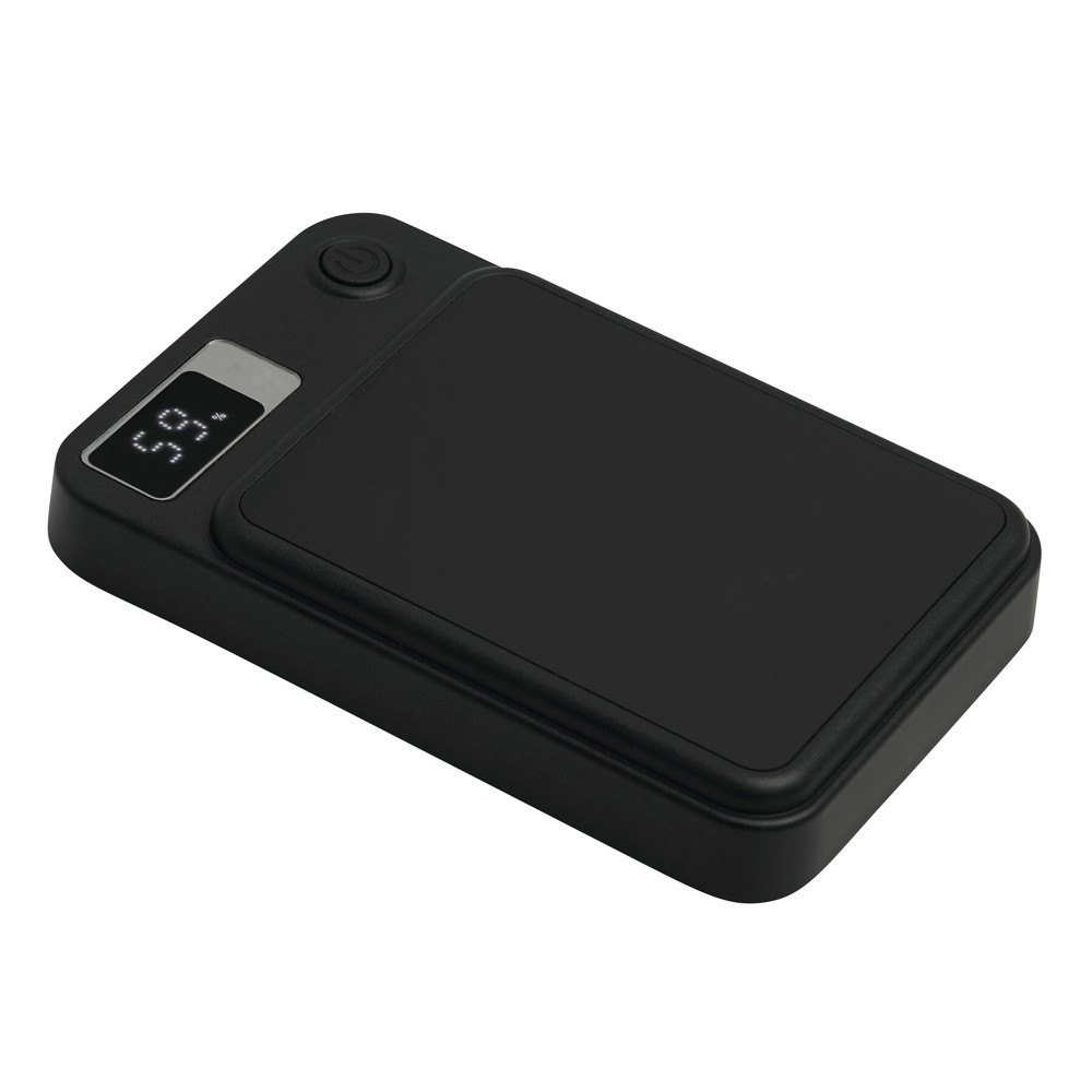 Powerbank MAGNET: geschikt voor smartphones en USB-apparaten, draadloos opladen van het apparaat door het op het contactoppervlak te plaatsen (apparaat moet zijn uitgerust voor inductief opladen), dankzij de magnetische kracht houdt het apparaat zich vast aan de powerbank (afhankelijk van het apparaat), incl. USB-kabel met USB type C stekker (lengte: ca. 30 cm), met laadniveau-indicator in procenten, aan/uit-schakelaar, krachtige batterij, capaciteit: 5.000 mAh, 1 USB type C en 1 USB type A aansluiting, ingangsvermogen: 5V/2A, uitgangsvermogen: 5V/2A