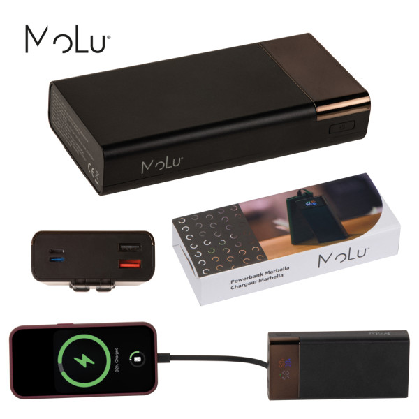 De ultieme mobiele voeding met onze powerbank, die een indrukwekkende capaciteit van 20.000 mAh biedt. Deze krachtige powerbank is voorzien van een snellaadfunctie waardoor jouw apparaten binnen een mum van tijd weer klaar zijn voor gebruik. Met twee USB-poorten, een USB-C-poort en een geïntegreerde iOS-kabel biedt hij diverse oplaadmogelijkheden voor al uw apparaten. Op het slimme LCD-laadscherm zie je in één oogopslag de huidige laadstatus en andere belangrijke informatie. Uw persoonlijke logo of reclameboodschap wordt prominent op de powerbank gedrukt en zorgt voor een opvallende en professionele presentatie van uw merk. Deze powerbank is het ideale relatiegeschenk of praktische accessoire voor het dagelijks leven, dat overtuigt door functionaliteit en hoogwaardige afwerking.