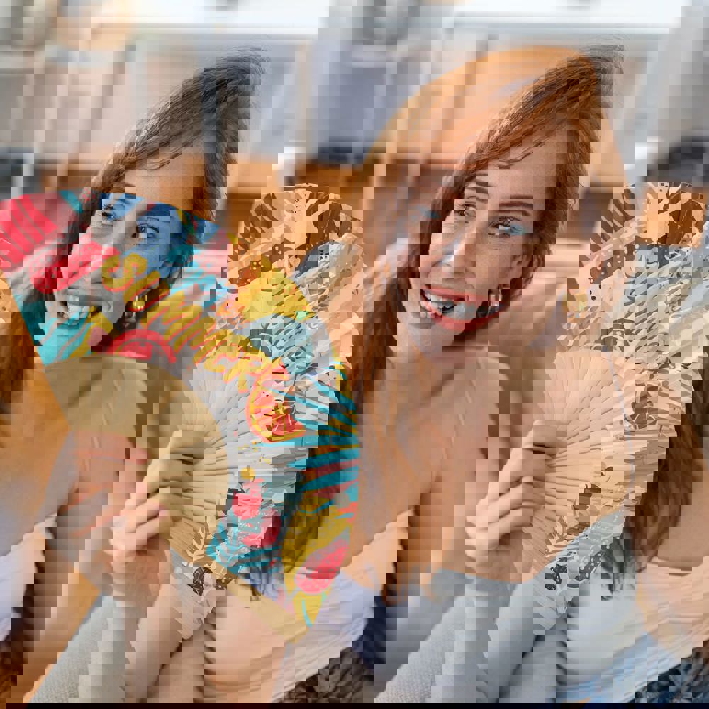 Waaier van hout & R-PET. Verkrijgbaar in verschillende felle kleuren met houten handvat; ideaal voor buiten evenementen en hete zomerdagen.