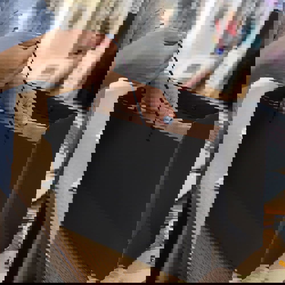 Elegante cadeautas gemaakt van papier, met 5 mm dikke handvatten van gerecycled polyester. Ontworpen om tot 5 kg te dragen, met een luxe uitstraling door de zwarte handvatten en een zwarte binnenafwerking. Perfect voor het presenteren van cadeaus.