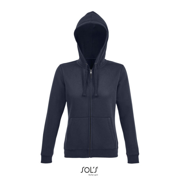 SOL'S SPIKE WOMEN. Hoodie met rits voor dames, 80% ringgesponnen katoen - 20% polyester geborstelde voering. Buitenkant: 100% katoen FLEECE 280 LSF (Low Shrinkage Fabric), ingezette mouwen, 2 buidelzakken voor, gesneden en gestikt, gevoerde capuchon met ton-sur-ton trekkoord, 2x2 geribde manchetten en zoom. Halve maan binnenkraag, getapete nek, YKK ritssluiting. OEKO-TEX®. Uitsluitend verkocht met opdruk.
