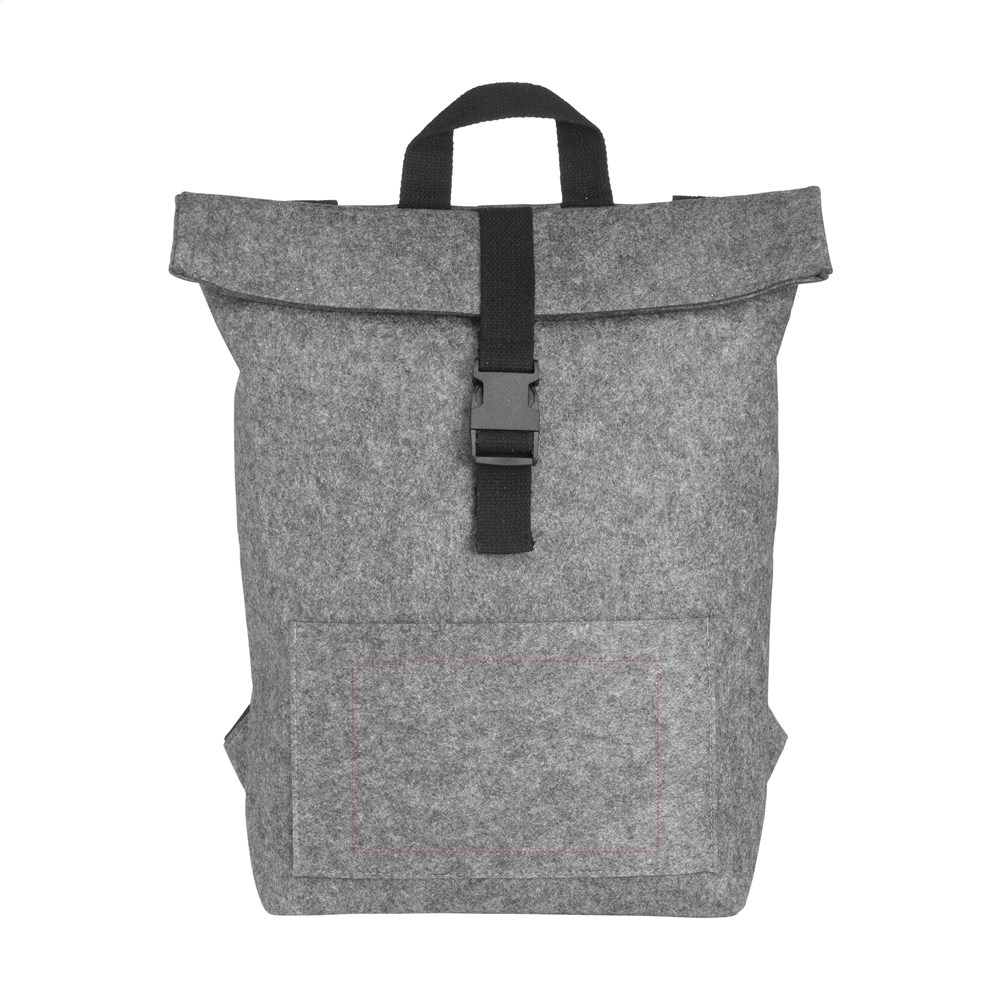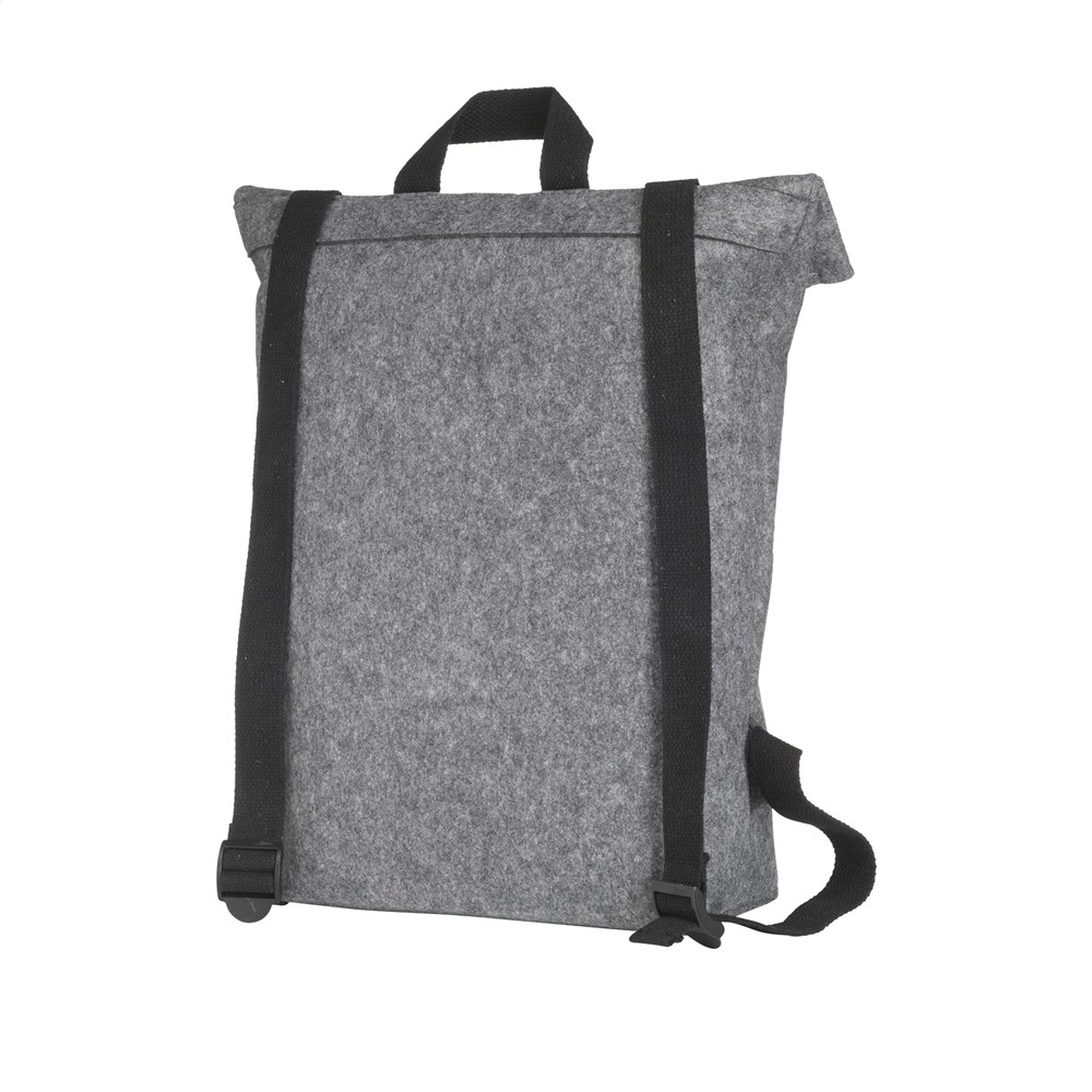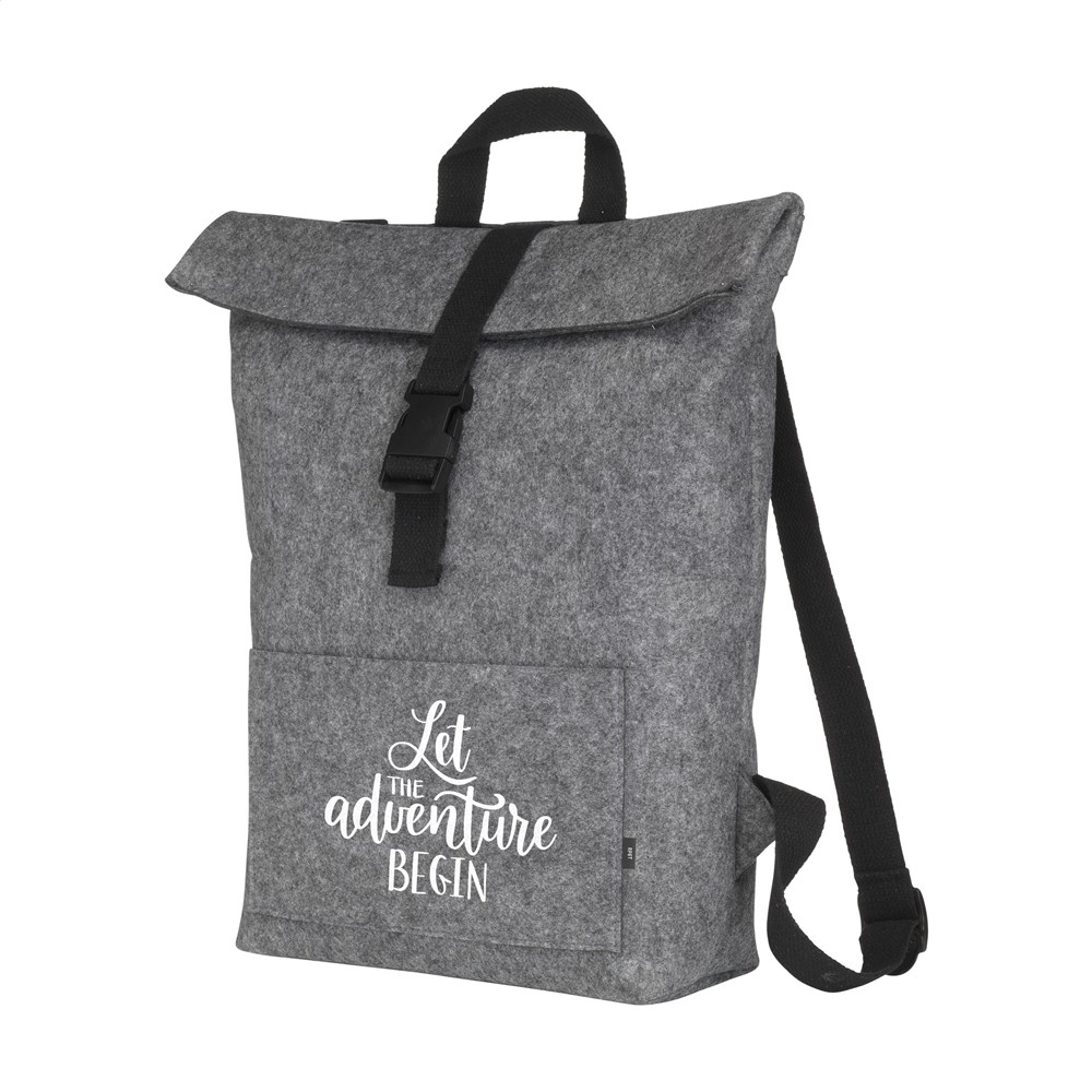 Stoere, praktische urban 'roll-top' rugzak van stevig RPET vilt. De rugzak heeft een ruim binnenvak en een insteekvak aan de voorzijde. Met draaglus en een rolsluiting met handig kliksysteem aan de bovenzijde. GRS-gecertificeerd. Totaal gerecycled materiaal: 80%. Inhoud ca. 15 liter.