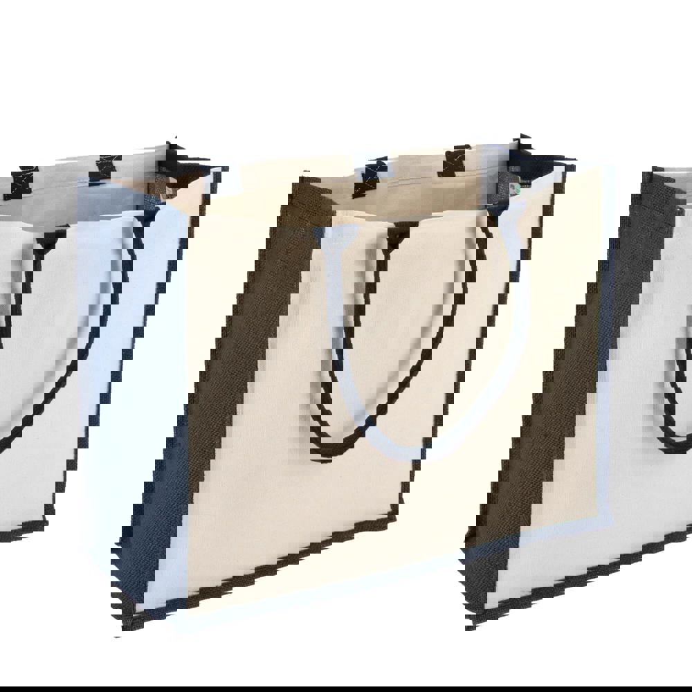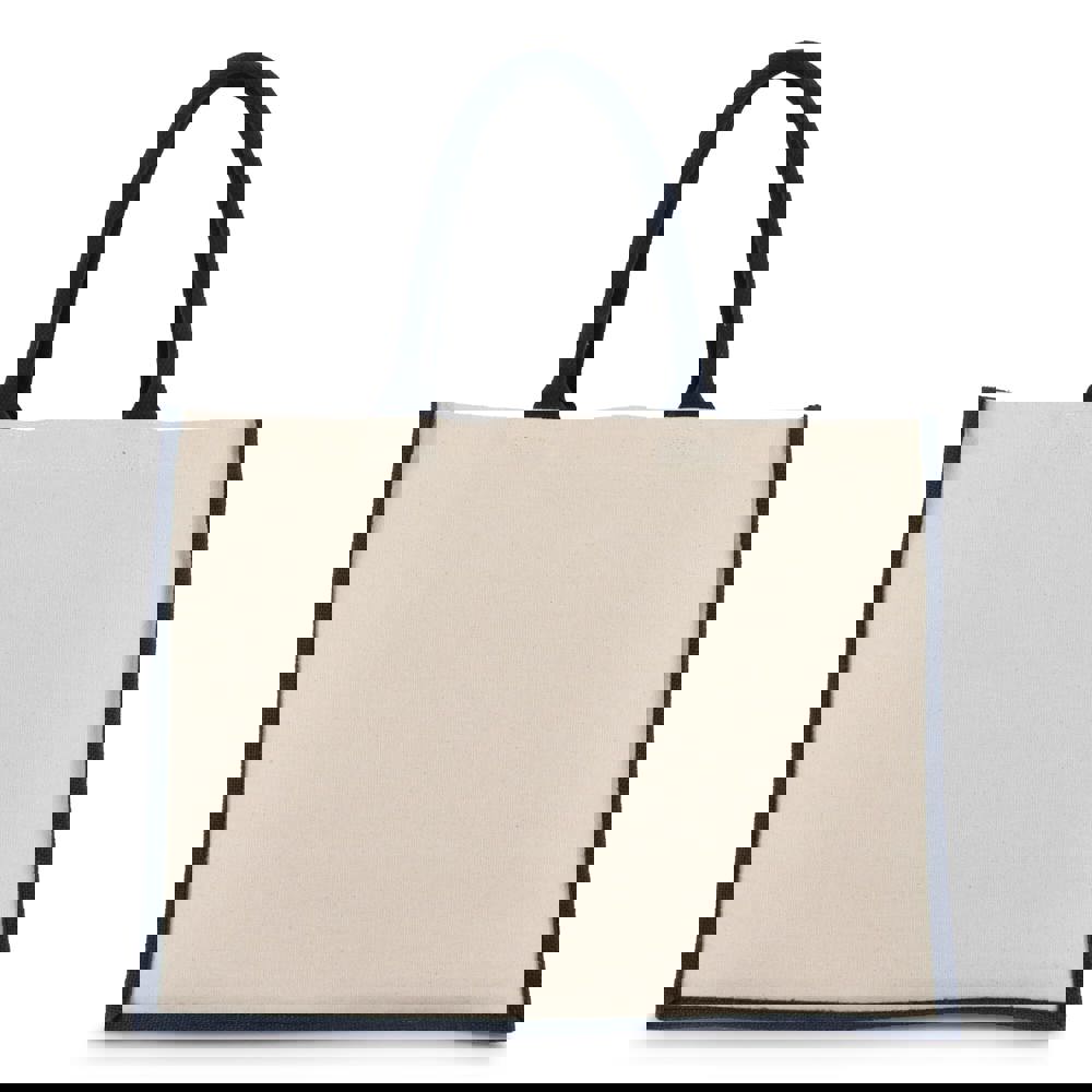 Stijlvolle tas met katoenen canvas voor- en achterpanelen en jute zijkanten en bodem – alles 320gsm. Afgewerkt met katoenen handvatten en zijkanten in accentkleuren voor een opvallende uitstraling. Oeko-Tex® gecertificeerd. Ideaal voor retail, events of dagelijks gebruik.