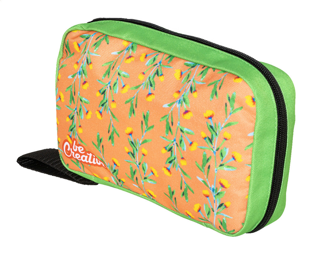 Custom made RPET-kabelorganizerhoes met ritssluiting en gaas in de compartimenten. Met overal sublimatie bedrukking. 600D RPET polyester met onderscheidend RPET label. MOQ: 25 stuks.