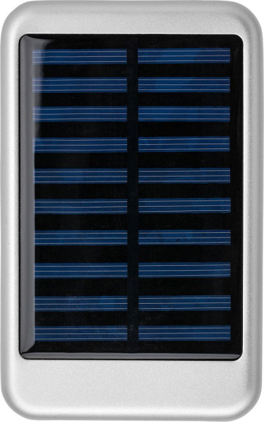 Aluminium solar powerbank met blauwe indicatielampjes. USB-A en USB-C-poort. Ingang DC5V/1A. Uitgang 5V/1A. Capaciteit: 4.000 mAh. Inclusief USB-kabel.