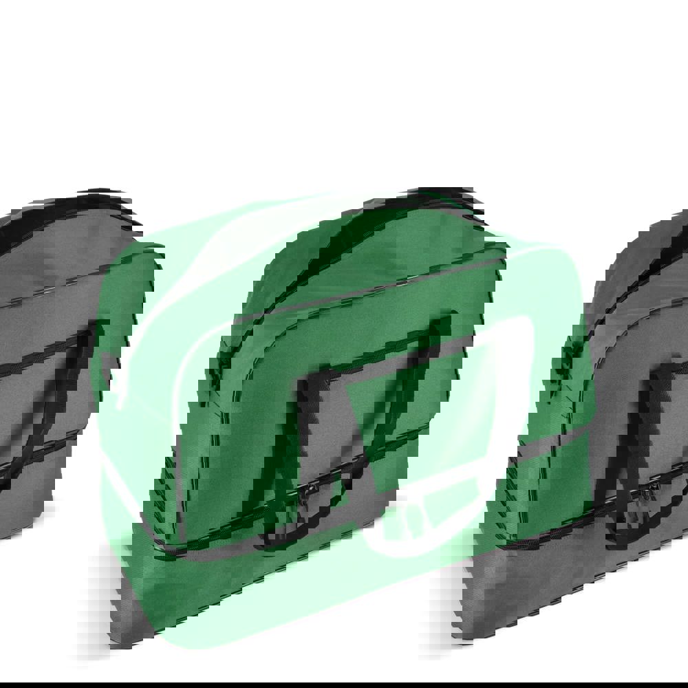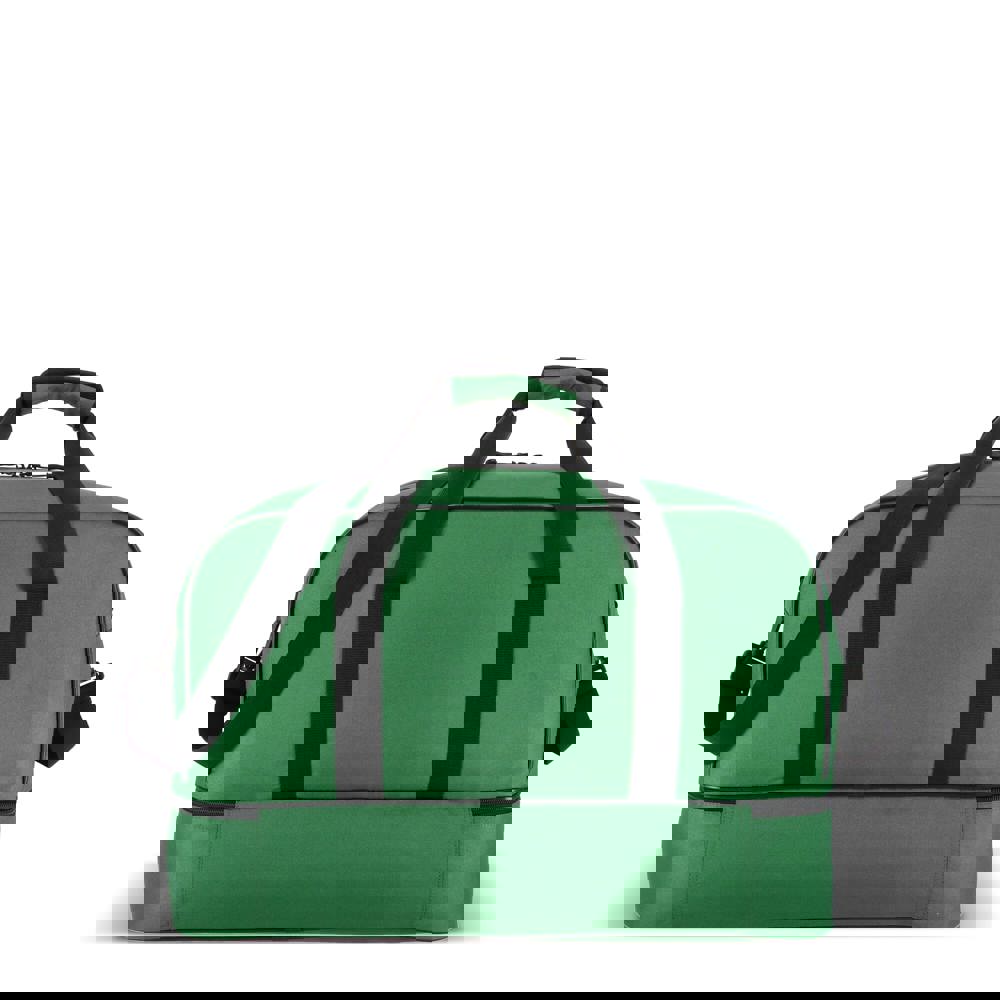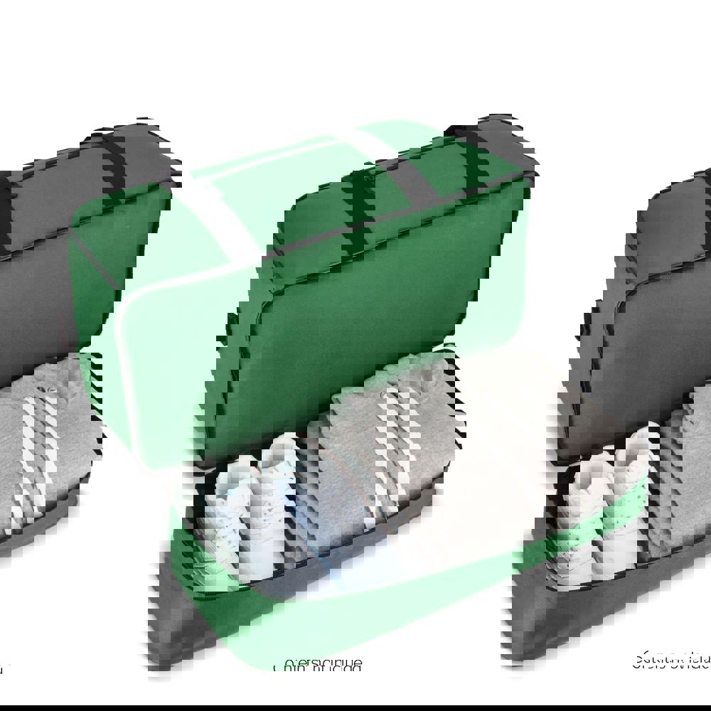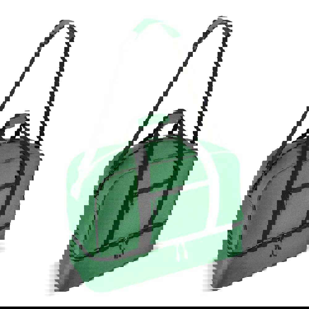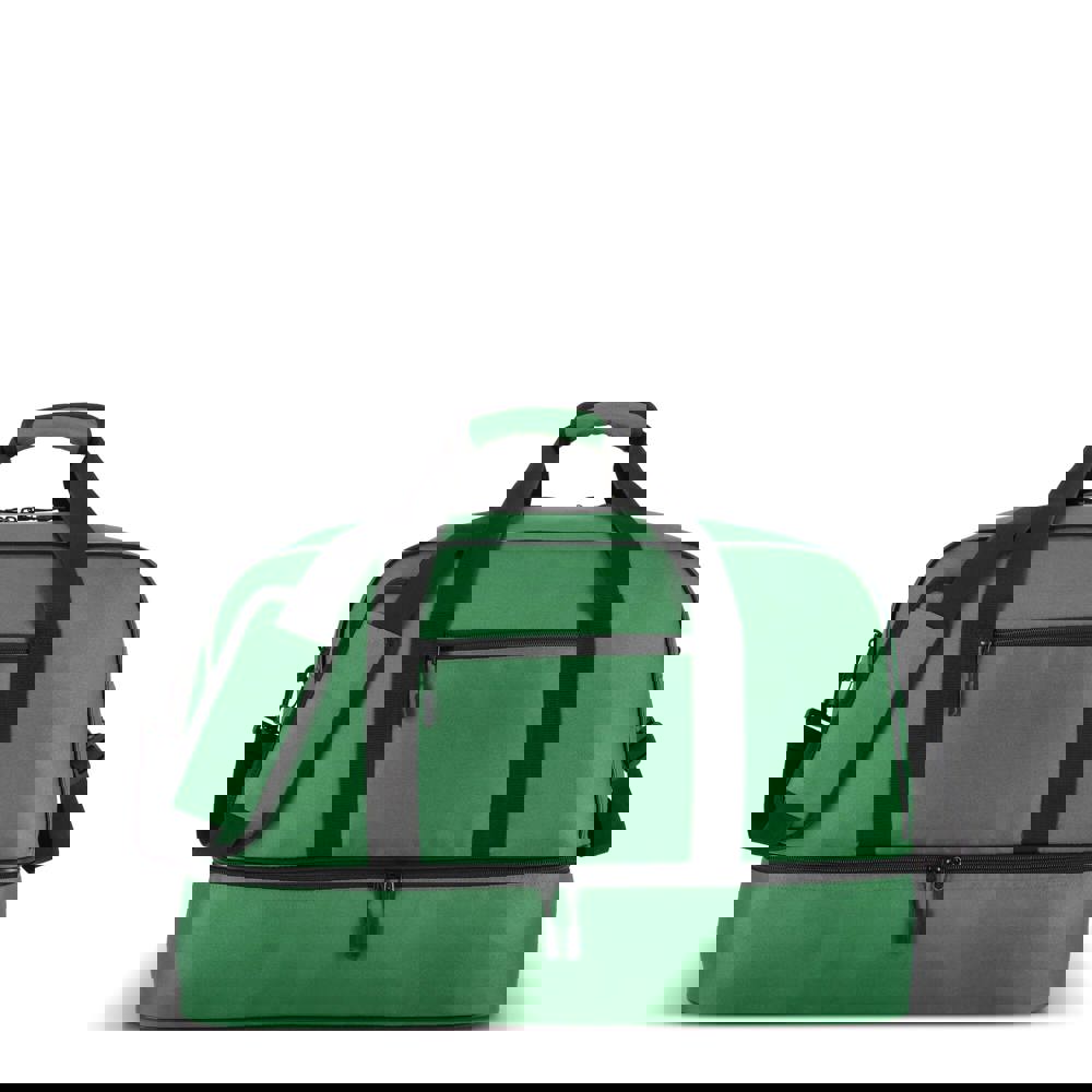 Reis- of sporttas met twee vakken, gemaakt van 600D gerecycled polyester. Voorzien van draaghandvatten, een afneembare en verstelbare schouderriem, een voorvak met ritssluiting en een bodemplaat voor stabiliteit. Twee vakken houden natte of vuile kleding en handdoeken gescheiden van andere spullen, of schoenen apart van kleding tijdens het reizen.