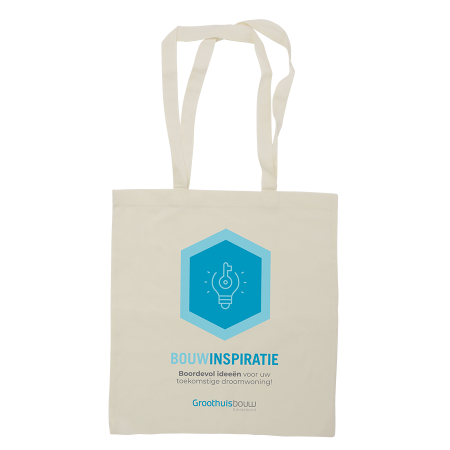 Deze ECO draagtas (390x410 mm) is een duurzame keuze, gemaakt van 100% bamboevezels (150 g/m2) en voorzien van lange hengsels (25x350 mm) die met versterkte kruissteken aan de tas zijn genaaid.