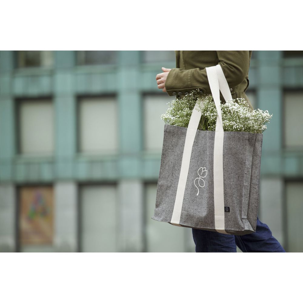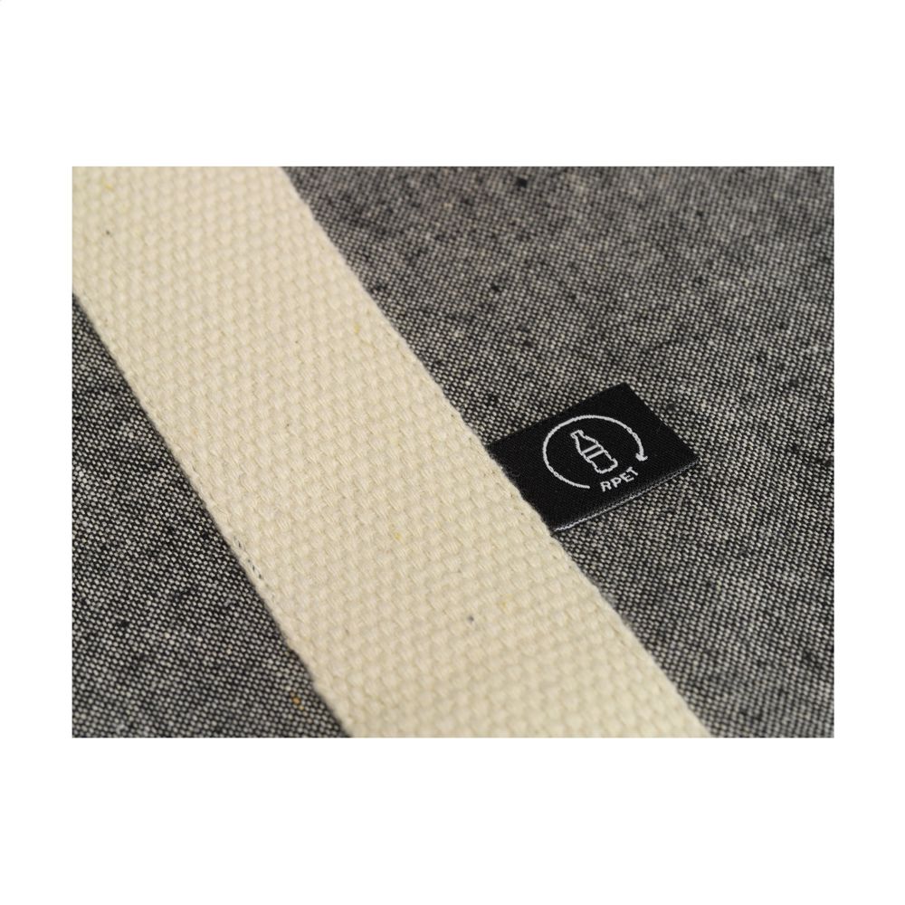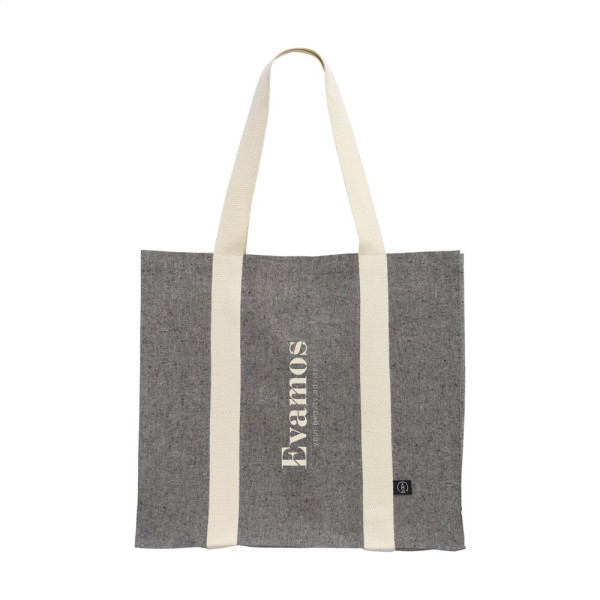 Royale, stevige winkeltas van 80% gerecycled, gemêleerd katoen en 20% gerecycled, gemêleerd polyester (210 g/m²). Met dichte, platte weving, lange hengsels en brede bodem. De hengsels zijn uitgevoerd in een opvallende geweven structuur en lopen als stevige banden verticaal over de tas, een fraai en decoratief detail. De tas is geschikt voor veelvuldig hergebruik. GRS-gecertificeerd. Inhoud ca. 18 liter.
