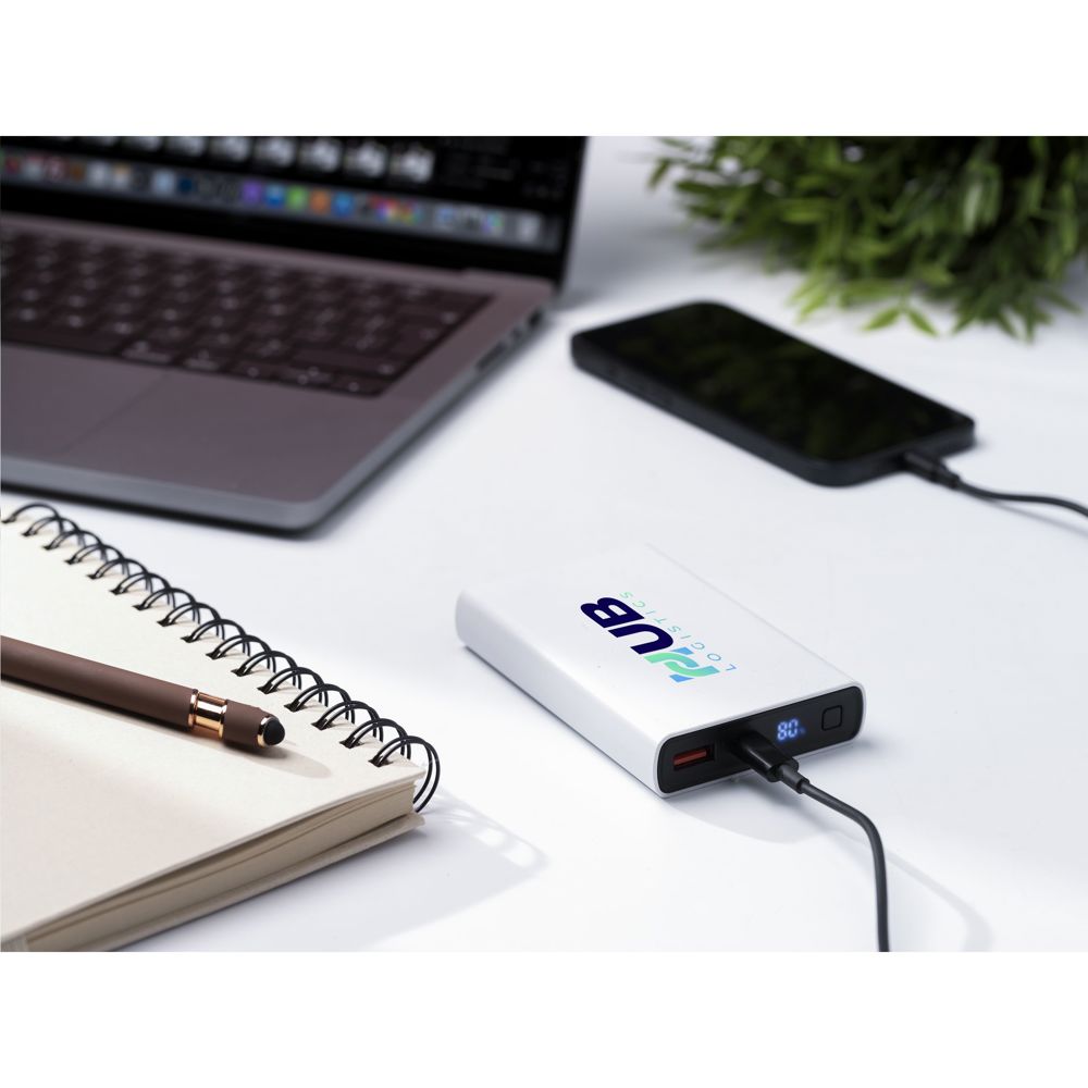 Krachtige powerbank met ingebouwde 10.000 mAh lithium-polymeerbatterij. De behuizing is gemaakt van 100% RCS-gecertificeerd gereycled ABS. Met aan/uitknop en een display met batterij-indicatie in procenten. Type-C input: DC5V/3A, 9V/2A, 12/1.5A. Type-C output: DC5V/3A, 9V/2.22A, 12/1.67A. USB-A-output: DC5V/3A, 9V/2A, 12/1.5A. Wired output: 22W. Inclusief rTPE oplaadkabel USB-C naar USB-C en gebruiksaanwijzing. Per stuk verpakt.