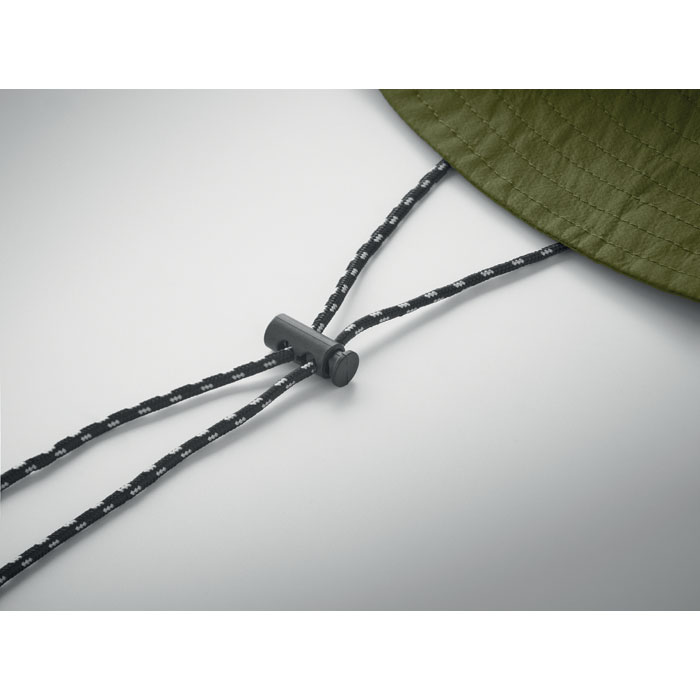 Waterafstotend vissershoedje van polyester, met geïntegreerd zakje aan de binnenkant van hetzelfde materiaal met ABS karabijnhaak. 64g/m².