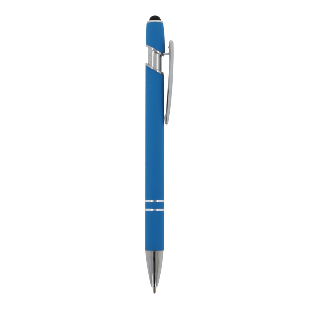 Aluminium balpen met elegante soft-touch afwerking en stylus. Met een solide metalen clip. Schrijfkleur: blauw.