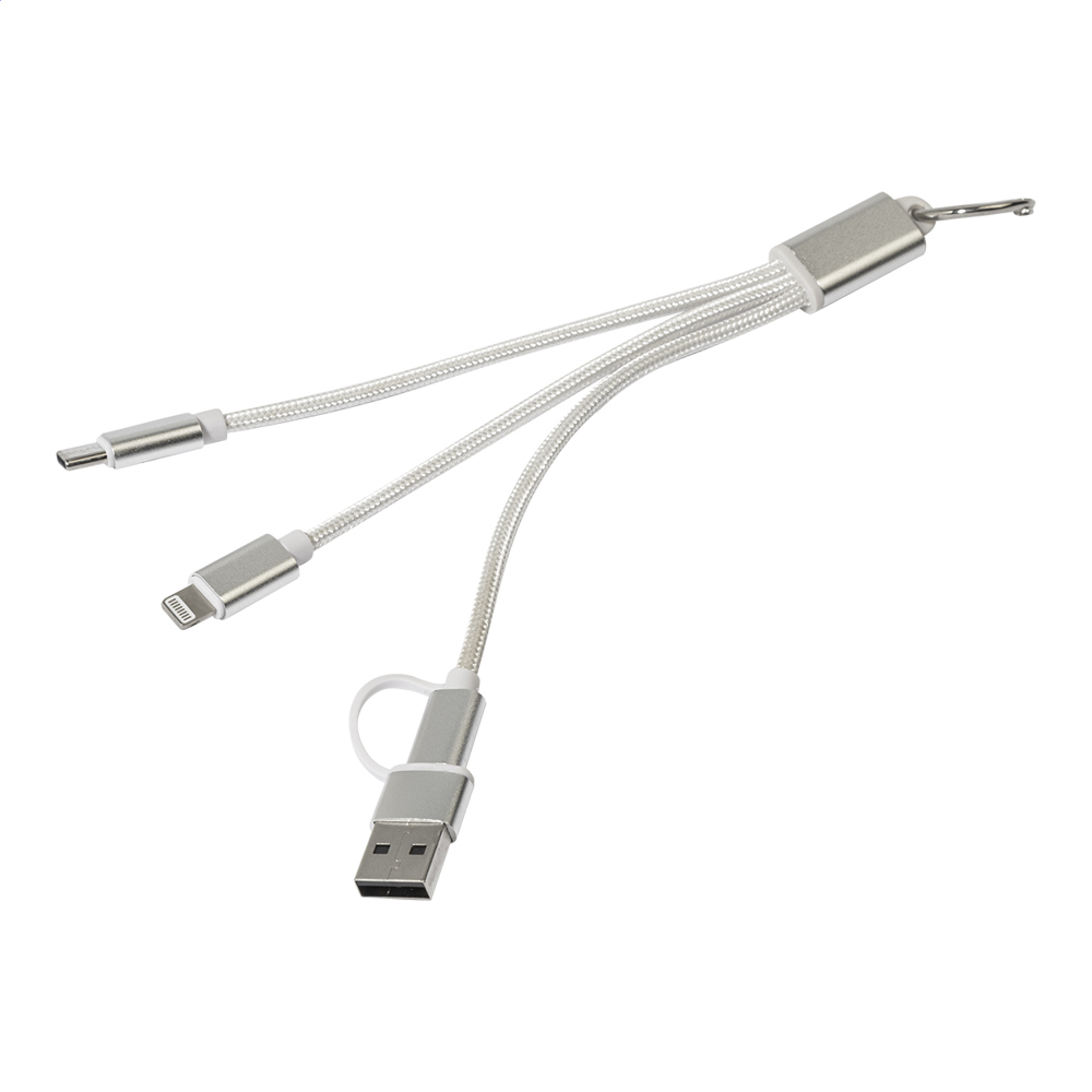 Gerecycled aluminium en RPET USB-opladerkabel met sleutelhanger. Met micro USB, USB-C en Lightning connectoren. Met USB en USB-C ingangen.