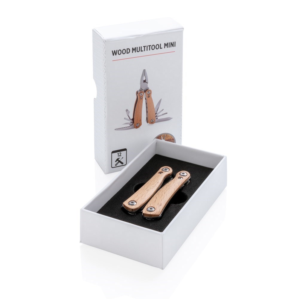 Compacte en duurzame multitool met 12 functies. Met beukenhouten behuizing en hoogwaardig roestvrij stalen gereedschap. Inclusief: langebektang, standaard tang, kniptang, gekarteld mes, klein mes, middelgrote schroevendraaier met platte kop, flesopener, grote schroevendraaier met platte kop, mes, kleine schroevendraaier met platte kop, kruiskopschroevendraaier, vijl/nagelreiniger. Verpakt in geschenkverpakking.