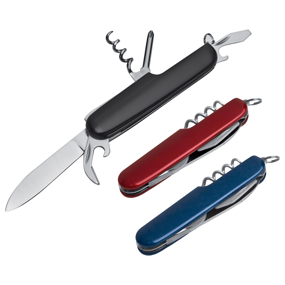 Dit handige zakmes is van roestvrij staal. Het mes heeft 7 functies waaronder een flesopener, kurkentrekker en een kruiskopschroevendraaier. De fraaie behuizing is van aluminium en is in metallic kleur gespoten. Uw reclame brengen wij aan d.m.v. een lasergravure. Ieder mes is per stuk verpakt in een kartonnen doosje.