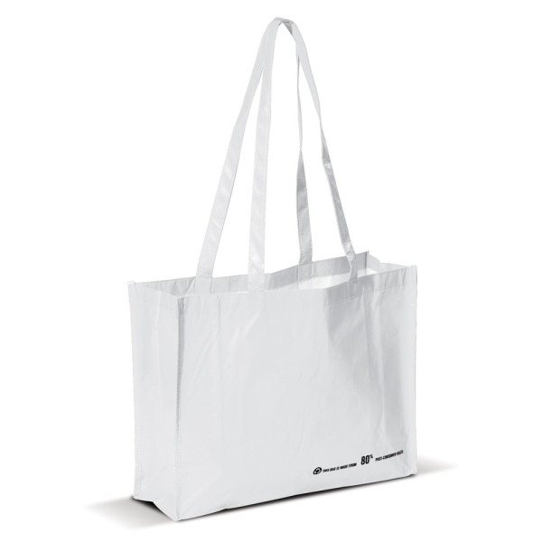 Stevige grote tas gemaakt van 80% gerecycleerd PET materiaal (plastic flessen). Groot drukoppervlak. Vanaf 3.000 stuks diverse formaten mogelijk.