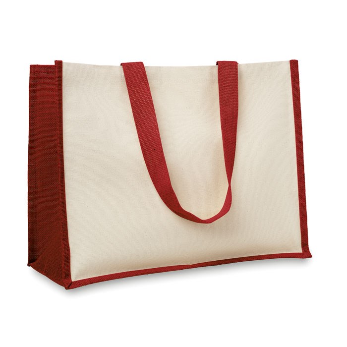 Boodschappentas van jute en canvas. Binnenzijde is gelamineerd. Lange hengsels.