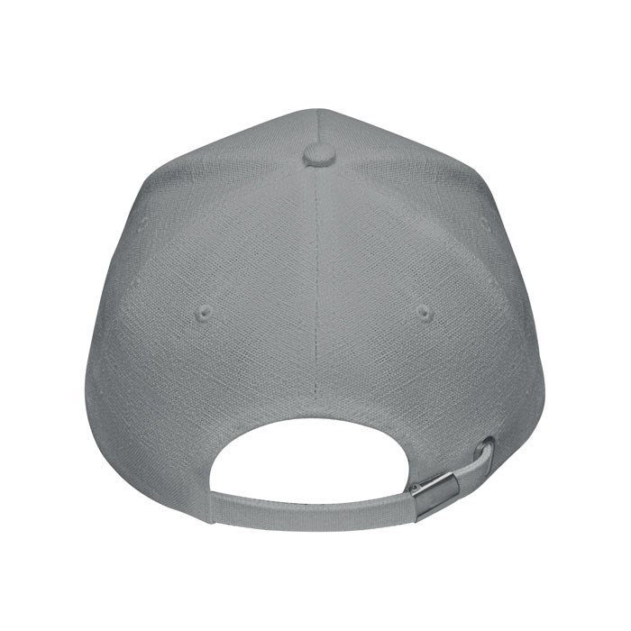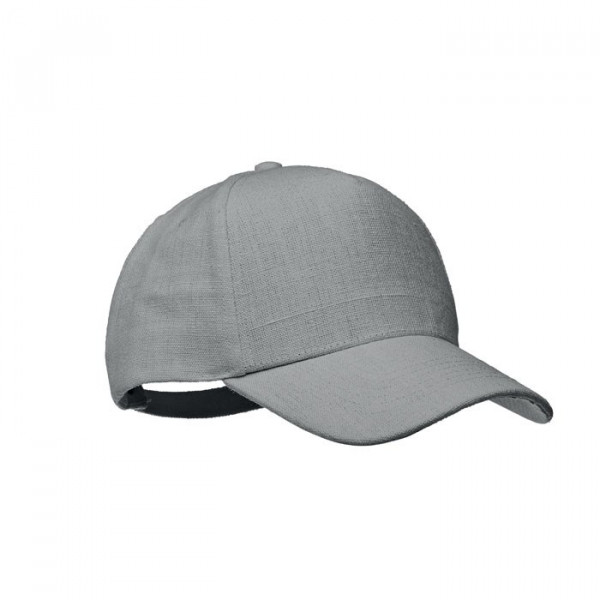 Baseballpet met 5 panelen van 100% hennep, 370 gr/m², met messing verstelbare sluiting en 5 geborduurde oogjes in de kleur van de cap. Maat 58 cm.