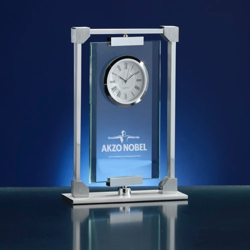 Omschrijving: Design klok in zilverkleur. Op het glas kan een logo of tekst geplaatst worden. - Afmeting: 127x50x184mm - Min.order:100 - Levertijd:4 weken - Tag: relatiegeschenk bureau accessoires, kristal, design, office, executive