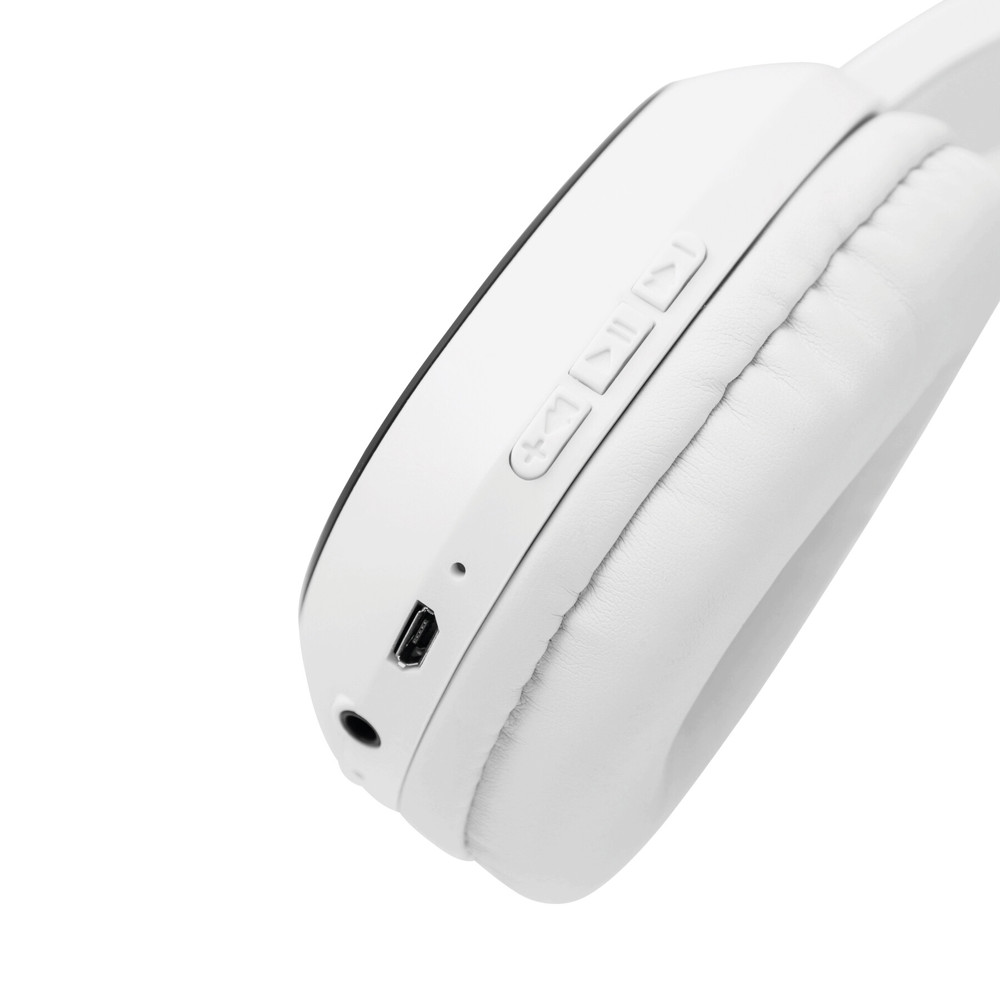 Wireless hoofdtelefoon INDEPENDENCE: oorschelpen en beugel gefoamd, bediening in rechter oorschelp, met handsfreefunctie, bereik ca. 10m., capaciteit 200 mAh, speelduur ca 5-6 uur, incl. USB-laadkabel (lengte ca. 50 cm.). Aansluiting voor busstekker 3,5mm plug aanwezig (incl. kabel, lengte ca. 50 cm.)